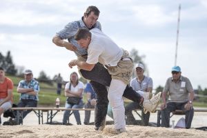 Der Eidgenosse Reto Nötzli (Pfäffikon) gewinnt in der zweiten Minute gegen den Einheimischen Andreas Gwerder (Hütten) mit Wyberhaken und Überdrücken am Boden.