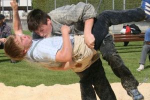 Bei den Ältesten (93-94) stehen zwei Emmentaler im Sägemehl, Schenk Patrick aus Sumiswald und Galli Markus aus Zäziwil. Markus gewinnt mit Übersprung und Nachdrücken.